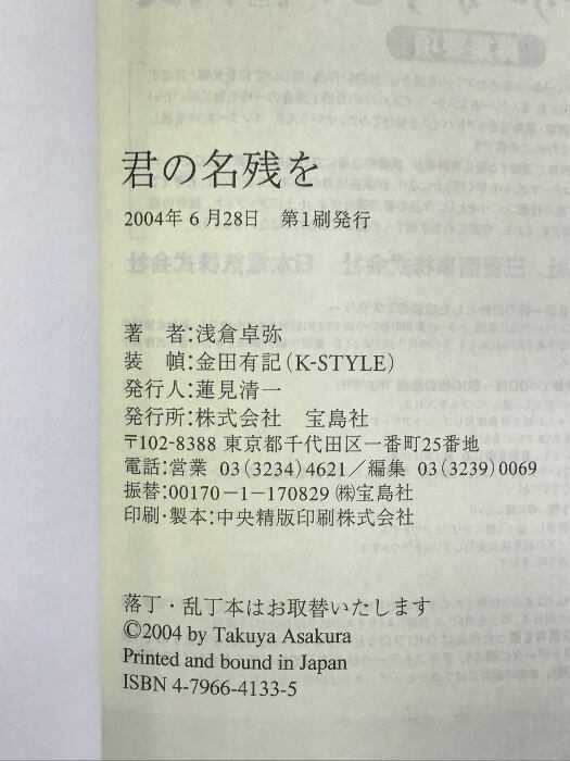 タイトル:君の名残を 宝島社 浅倉 卓弥
