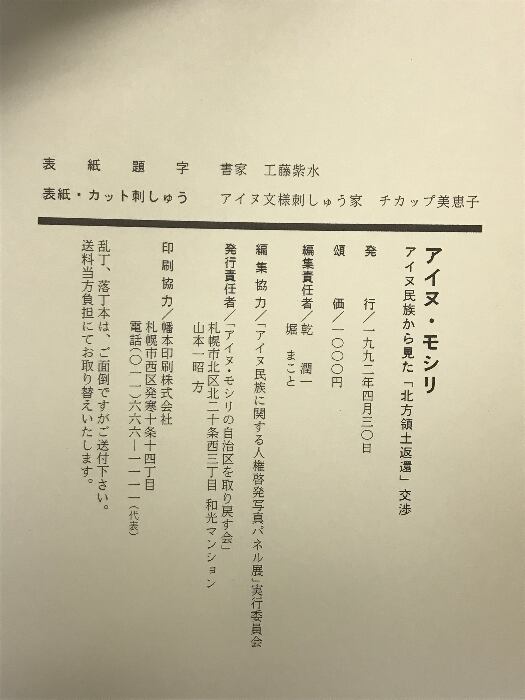 タイトル:アイヌ・モシリ アイヌ民族からみた『北方領土返還』交渉 1992年 発行:アイヌモシリの自治区を取り戻す会