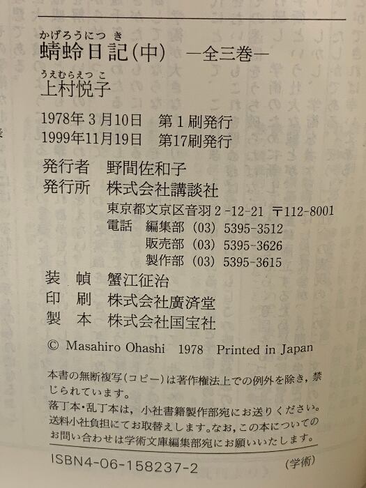 蜻蛉日記 中 (講談社学術文庫 237) 講談社 上村 悦子