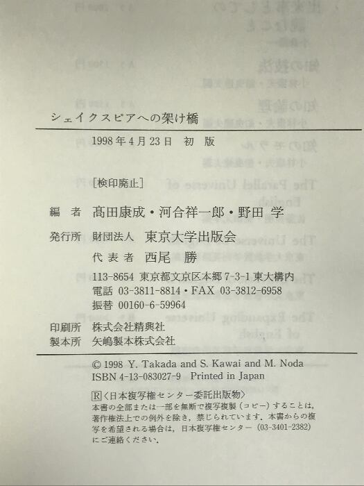 シェイクスピアへの架け橋 東京大学出版会 高田 康成