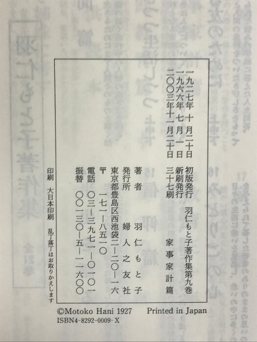 羽仁もと子著作集 9 家事家計篇 婦人之友社 羽仁 もと子