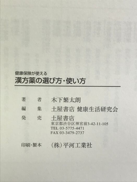 タイトル:健康保険が使える漢方薬の選び方・使い方 土屋書店 木下 繁太朗