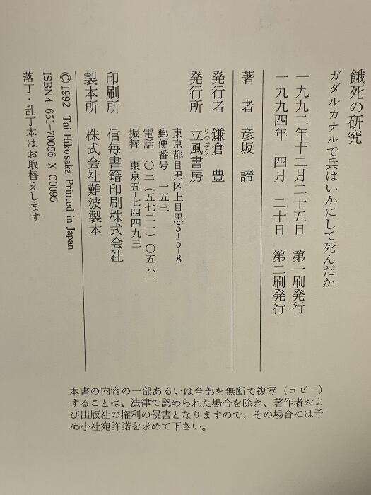 タイトル:餓死の研究: ガダルカナルで兵はいかにして死んだか 立風書房 彦坂 諦