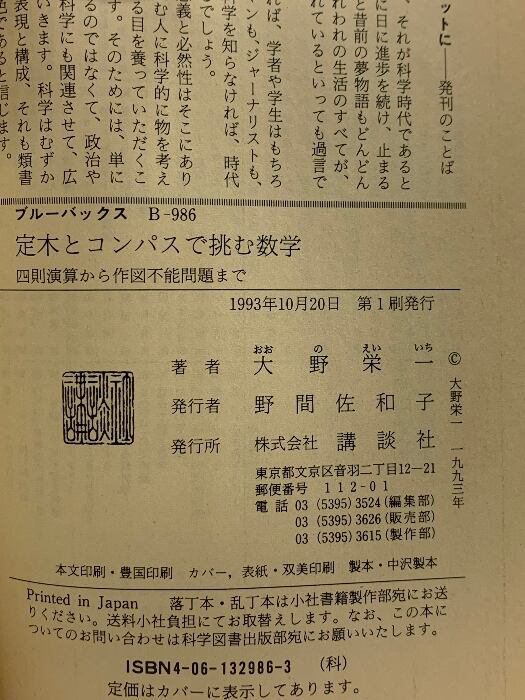 タイトル:定木とコンパスで挑む数学: 四則演算から作図不能問題まで (ブルーバックス 986) 講談社 大野 栄一