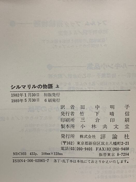 シルマリルの物語: シルマリルリオン (上) 評論社 J.R.R. トールキン