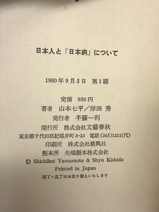 タイトル:日本人と「日本病」について 文藝春秋 山本七平 岸田秀