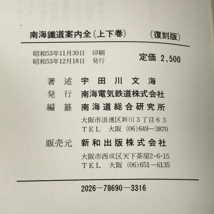 南海鉄道案内 全(上下巻) 復刻版 宇田川文海 新和出版社