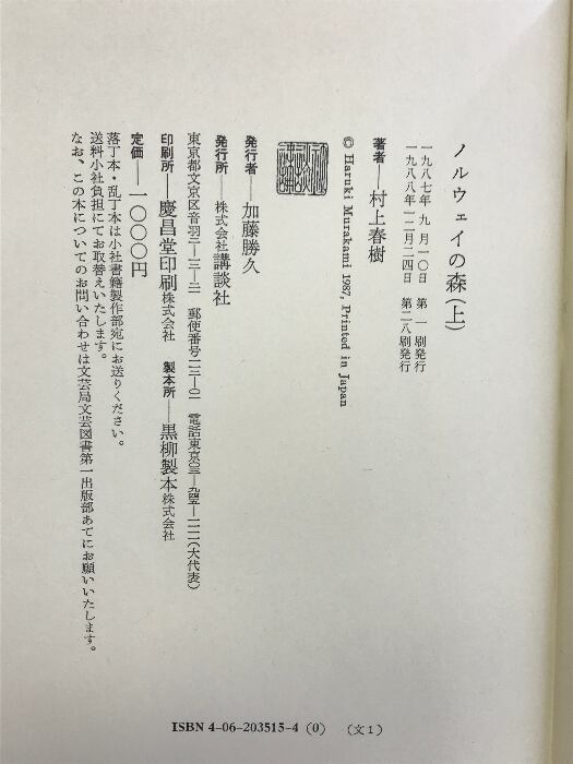 タイトル:ノルウェイの森 上・下巻セット 講談社 村上春樹