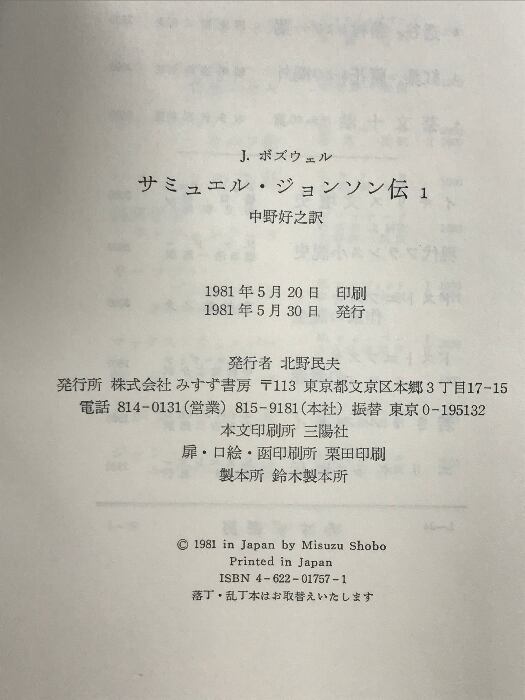タイトル:サミュエル・ジョンソン伝 1 みすず書房 J.ボズウェル