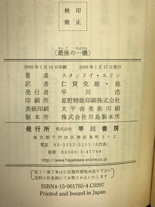 最後の一壜 (ハヤカワ・ポケット・ミステリ) (ハヤカワ・ミステリ 1765) 早川書房 スタンリイ エリン