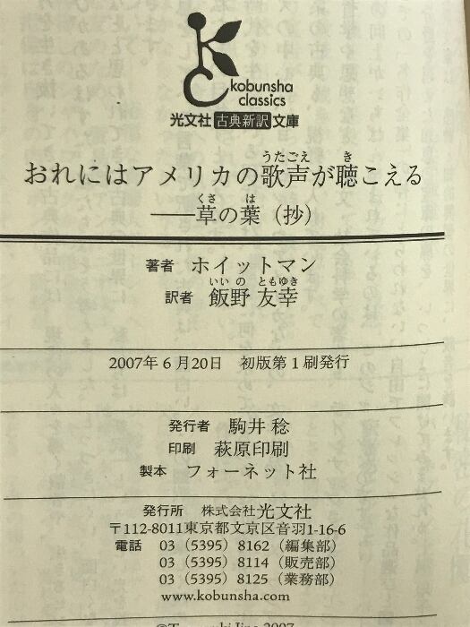 タイトル:おれにはアメリカの歌声が聴こえる: 草の葉(抄) (光文社古典新訳文庫 Aホ 2-1) 光文社 ウォルト ホイットマン
