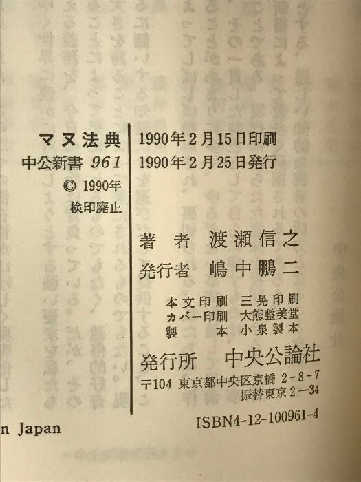 タイトル:マヌ法典: ヒンドゥー教世界の原型 (中公新書 961) 中央公論新社 渡瀬 信之
