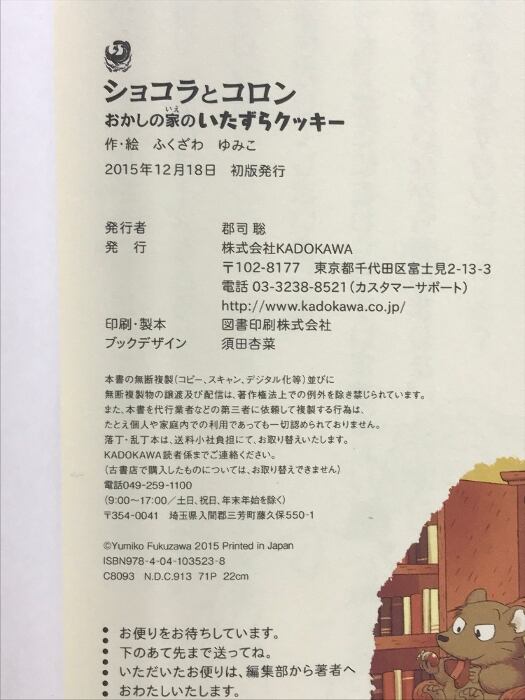 タイトル:ショコラとコロン おかしの家のいたずらクッキー KADOKAWA/角川書店 ふくざわ ゆみこ