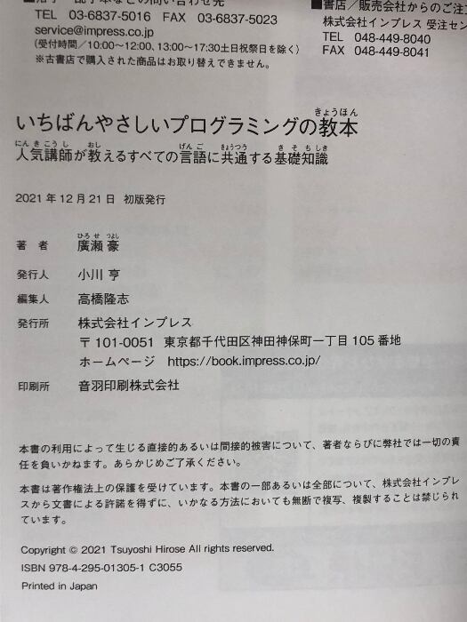 (無料電子版特典付)いちばんやさしいプログラミングの教本 人気講師が教えるすべての言語に共通する基礎知識 (いちばんやさしい教本) インプレス 廣瀬 豪