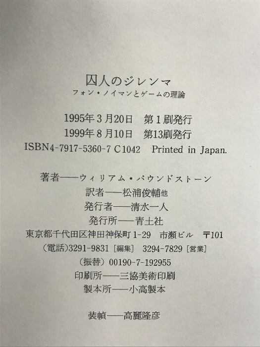 タイトル:囚人のジレンマ: フォン・ノイマンとゲームの理論 青土社 ウィリアム パウンドストーン