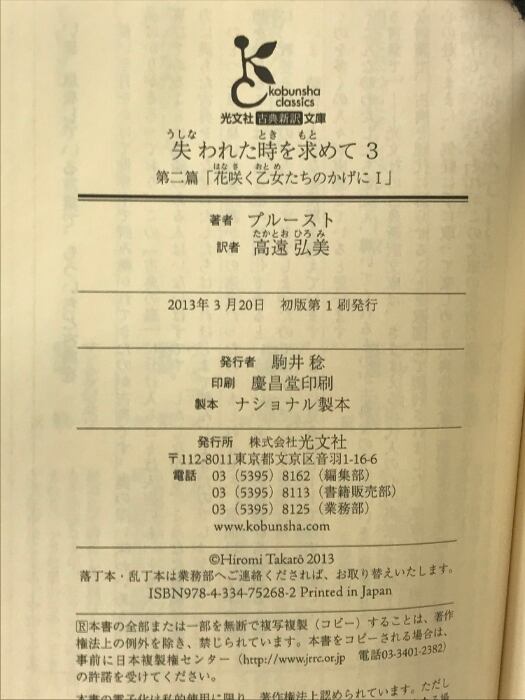 失われた時を求めて 3 第2篇 (光文社古典新訳文庫 Aフ 4-4) 光文社 マルセル プルースト