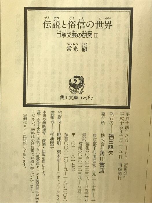 タイトル:伝説と俗信の世界: 口承文芸の研究2 (角川ソフィア文庫 280 怪BOOKS) KADOKAWA 常光 徹