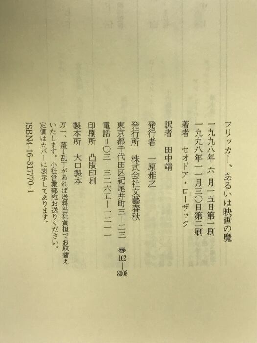 タイトル:フリッカー、あるいは映画の魔 文藝春秋 セオドア ローザック