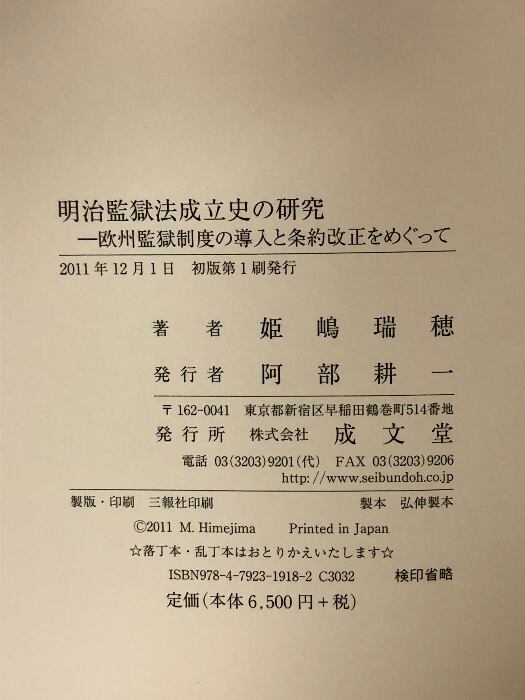 タイトル:明治監獄法成立史の研究: 欧州監獄制度の導入と条約改正をめぐって 成文堂 姫嶋 瑞穂