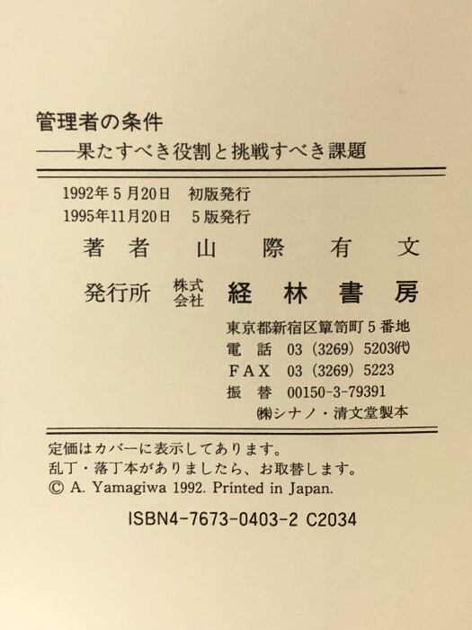 タイトル:管理者の条件: 果たすべき役割と挑戦すべき課題 理解を深めるまとめ&自己チェック方式 経林書房 山際 有文