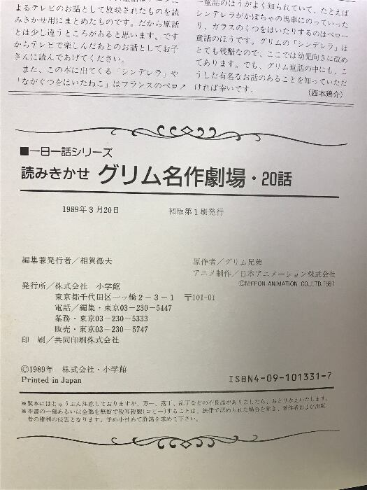 読みきかせグリム名作劇場20話: テレビアニメ (一日一話シリーズ) 小学館 ヤーコプ ルートヴィッヒ グリム
