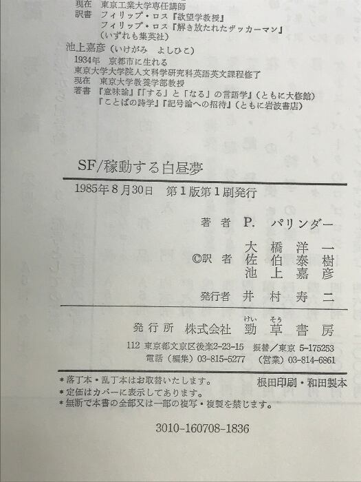 SF/稼動する白昼夢 勁草書房 パトリック・パリンダー