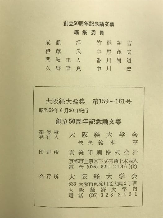 タイトル:大阪経済大学創立五十周年記念論文集 第159~161号 昭和59年 発行:大阪経大学会