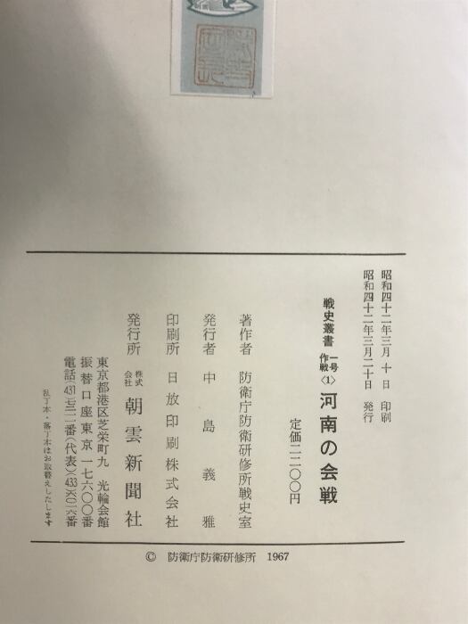 タイトル:戦史叢書 1号作戦(1)河南の会戦 防衛庁防衛研究所戦史:室著 朝雲新聞社 昭和42年