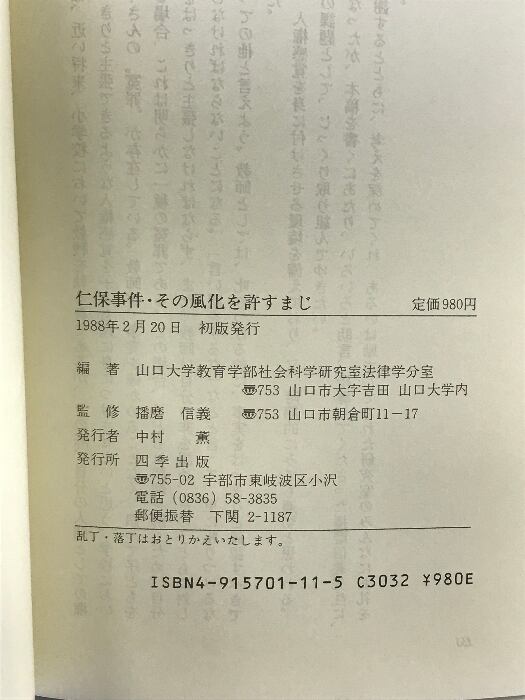タイトル:仁保事件・その風化を許すまじ: 学生による冤罪研究 四季出版 山口大学教育学部社会科学研究室法律学分室