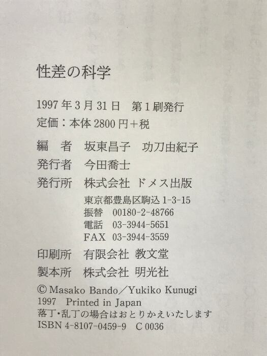タイトル:性差の科学 ドメス出版 坂東 昌子
