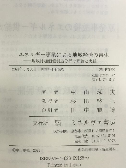 タイトル:エネルギー事業による地域経済の再生:地域付加価値創造分析の理論と実践 ミネルヴァ書房 中山琢夫