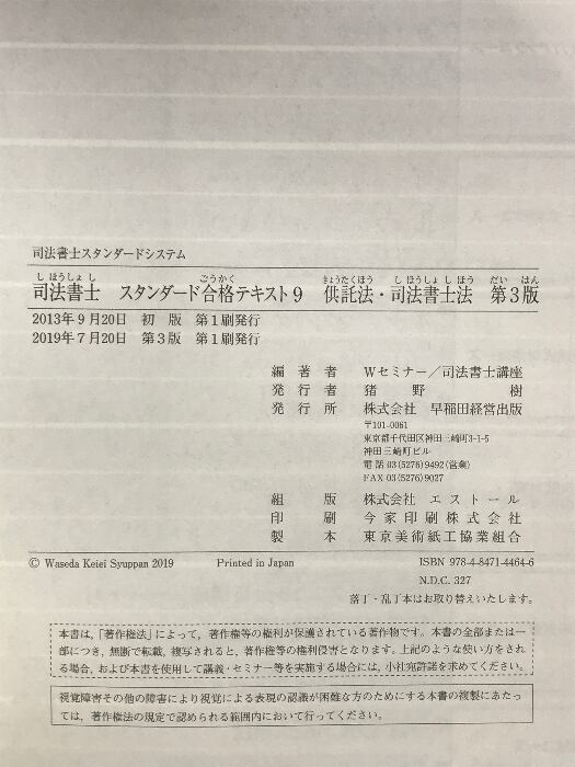 タイトル:司法書士 スタンダード合格テキスト (9) 供託法・司法書士法 第3版 早稲田経営出版 Wセミナー/司法書士講座