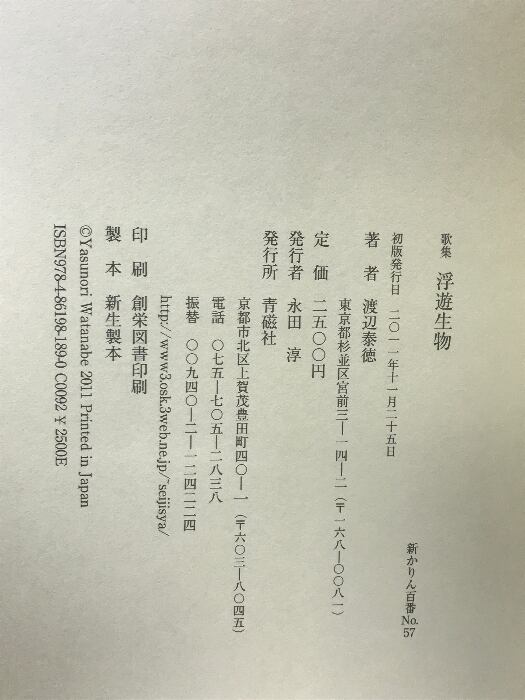 タイトル:浮遊生物―渡辺泰徳歌集 (新かりん百番) 青磁社(京都) 渡辺泰徳