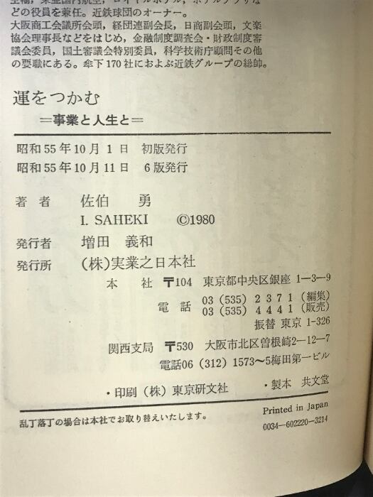 タイトル:運をつかむ―事業と人生と 実業之日本社 佐伯勇