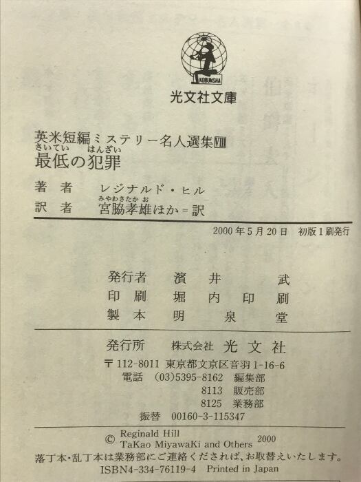 最低の犯罪 (光文社文庫 ヒ 4-1 英米短編ミステリー名人選集 8) 光文社 レジナルド ヒル