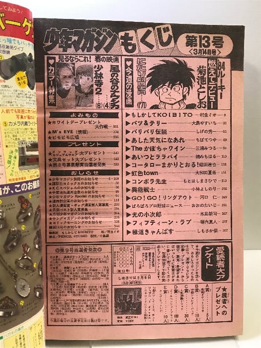 週刊少年マガジン NO.13 1984年3月14日号 講談社 あした天気になぁれ/ちばてつや 光の小次郎/水島新司 少林寺2 風の谷のナウシカ