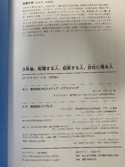 タイトル:3年後、転職する人、起業する人、会社に残る人 クロスメディア・パブリッシング(インプレス) 佐藤 文男