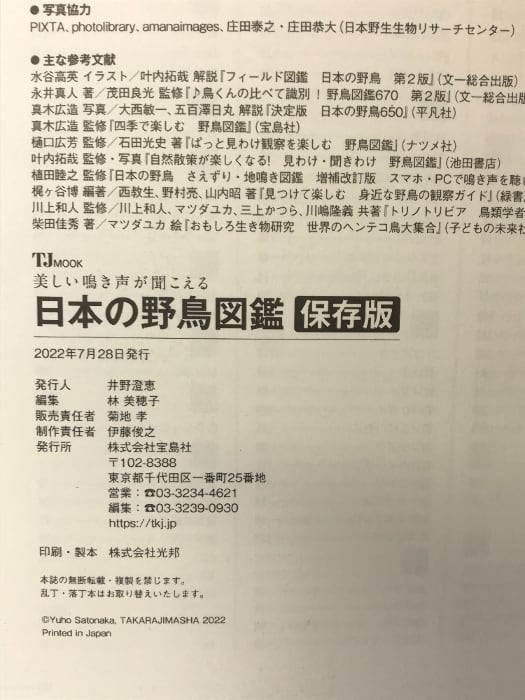 タイトル:美しい鳴き声が聞こえる 日本の野鳥図鑑(保存版)監修:里中遊歩 宝島社 2022年