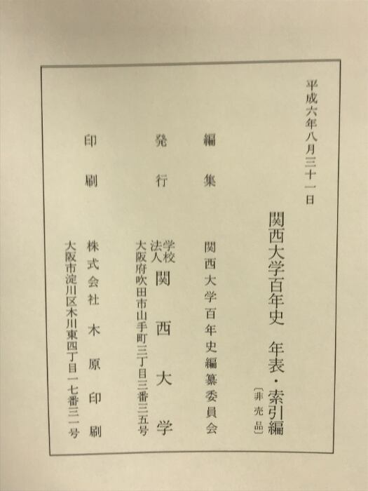 関西大学百年史 (年表・索引編)平成6年 発行:関西大学 (非売品)