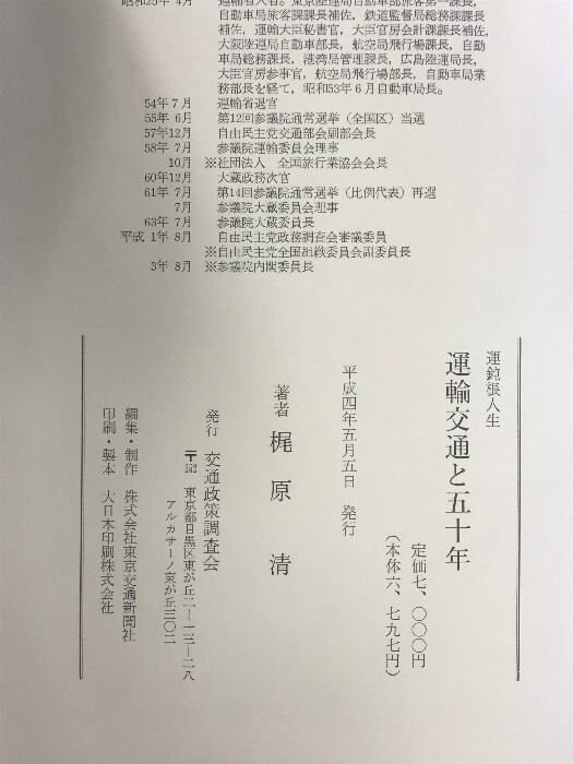 運輸交通と五十年 梶原清 発行:交通政策調査会 平成4年