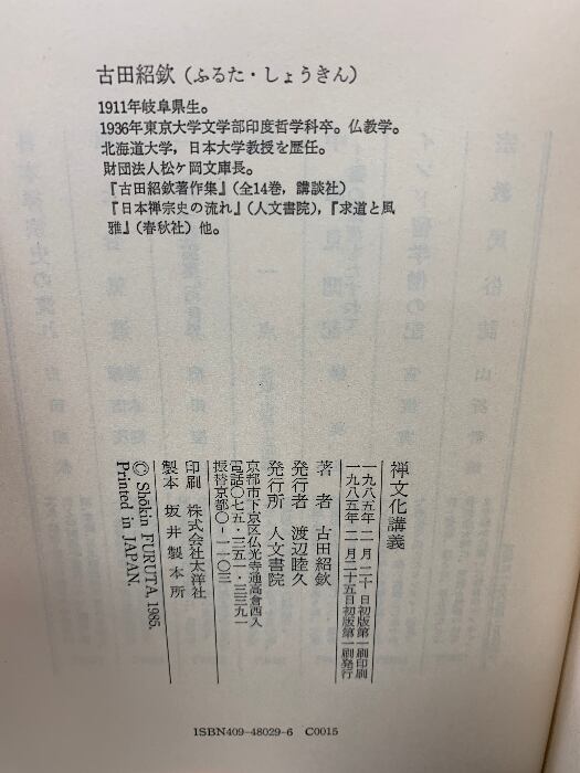 タイトル:禅文化講義 人文書院 古田 紹欽