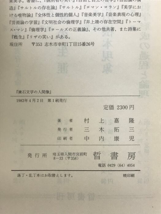 タイトル:漱石文学の人間像―自我の相剋と倫理 晢書房 村上 嘉隆