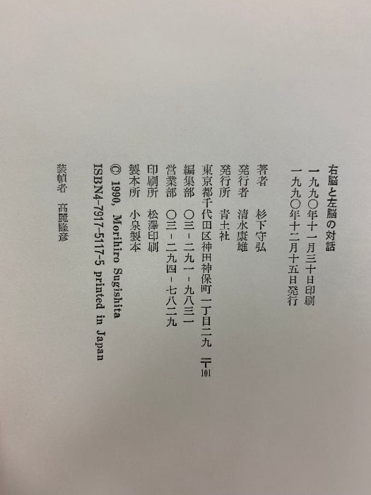 タイトル:右脳と左脳の対話 青土社 杉下 守弘