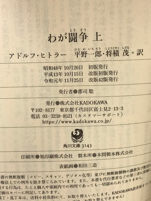 文庫 わが闘争 完訳 上 KADOKAWA 平野一郎