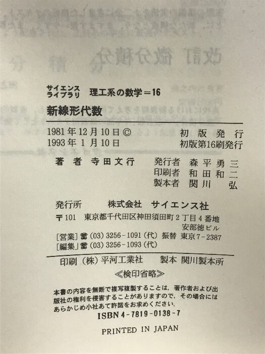 新線形代数 (サイエンスライブラリ理工系の数学 16) サイエンス社 寺田 文行