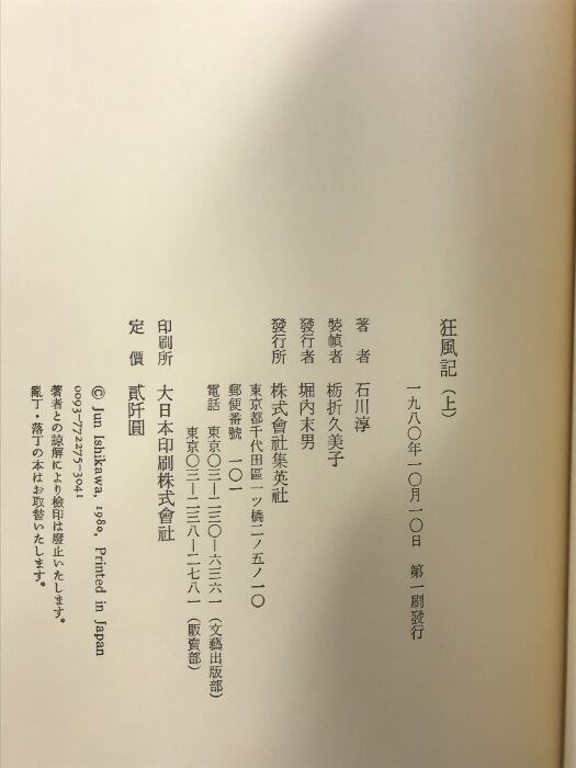 タイトル:狂風記 (上・下巻/全2冊セット) 石川淳 集英社 1980年