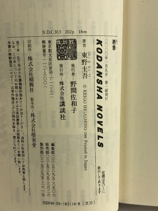 悪意 (講談社ノベルス ヒC- 9) 講談社 東野 圭吾