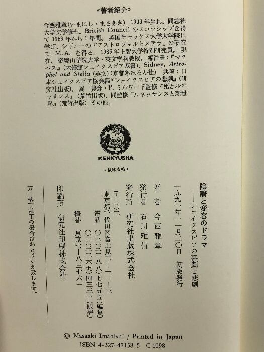 タイトル:陰翳と変容のドラマ: シェイクスピアの喜劇と悲劇 研究社 今西 雅章