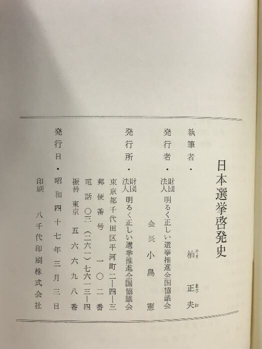タイトル:日本選挙啓発史 財団法人明るく正しい選挙推進全国協議会 昭和47年 発行:小島憲