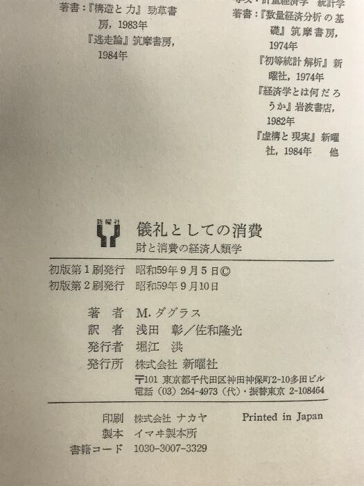 タイトル:儀礼としての消費―財と消費の経済人類学 新曜社 メアリー・ダグラス バロン・イシャウッド 浅田彰 他:訳